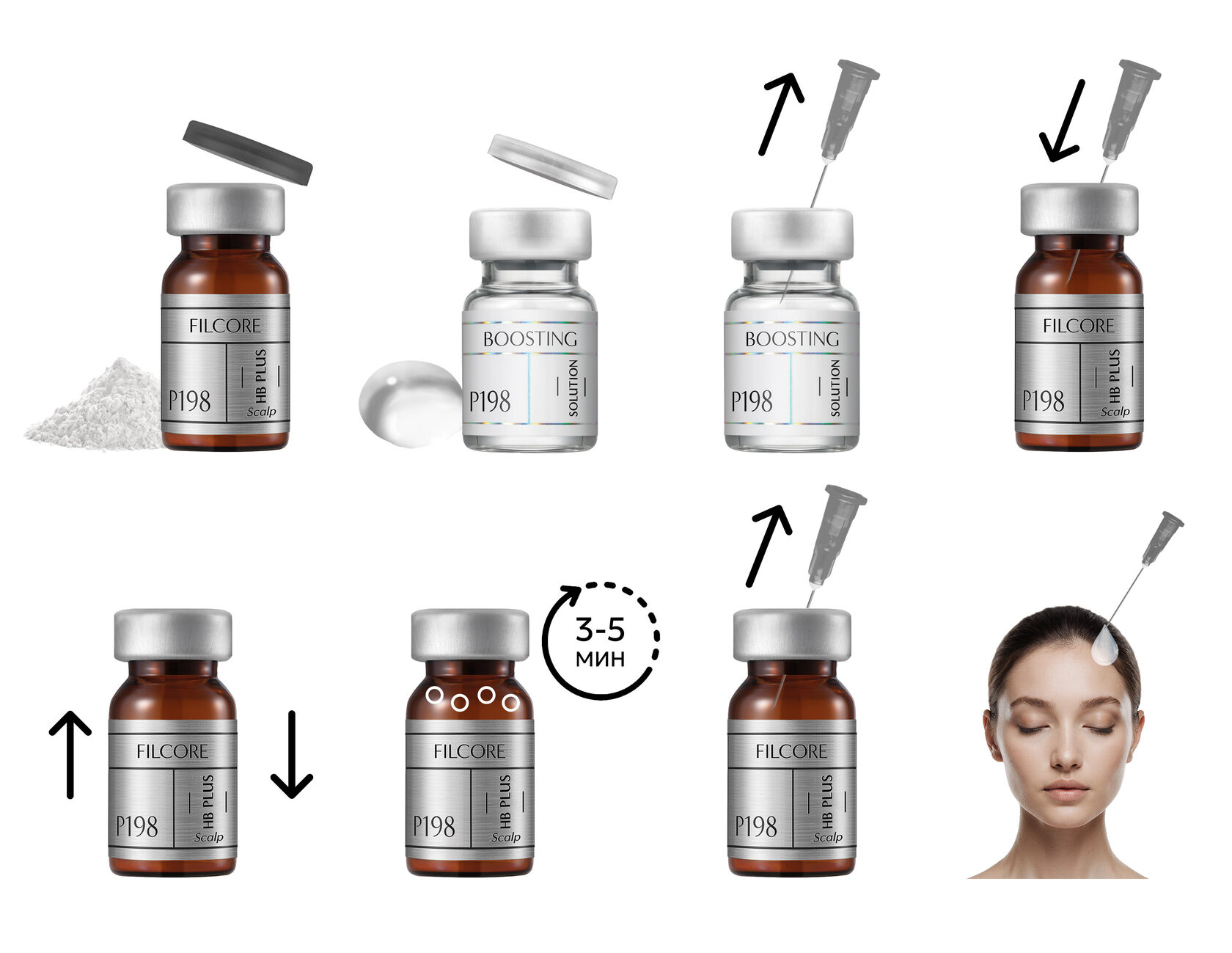 1. Снимите защитную крышку с флакона лиофилизированной пудры P198. 2. Снимите защитную крышку с флакона Активатора P198. 3. Наберите Активатора Р198 в стерильный шприц. 4. Введите Активатор Р198 во флакон с лиофилизированной пудрой Р198. 5. Аккуратно встряхните флакон до полного растворения содержимого. 6. Оставьте на 3–5 минут для активации раствора. 7. Наберите готовый раствор в стерильный шприц. 8. Нанесите препарат на необходимый участок кожи.
