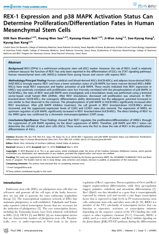Исследование показало, что экспрессия REX-1 способствует пролиферации мезенхимальных стволовых клеток из пуповинной крови человека, тогда как активация p38 MAPK ассоциирована с их дифференцировкой. Эти данные раскрывают молекулярные механизмы регенерации и подтверждают значение таких факторов при применении продуктов, как P198 ExoHealer.