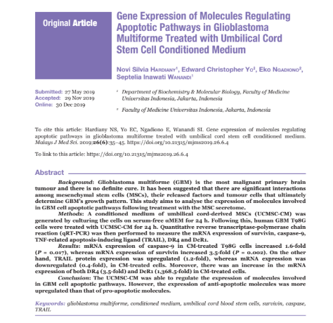 В доклиническом исследовании показано, что кондиционированная среда, полученная из стволовых клеток пуповинной крови, модулирует экспрессию генов, участвующих в апоптозе клеток глиобластомы. Было зафиксировано снижение активности провоспалительных и проапоптотических факторов, а также усиление экспрессии антиапоптотических молекул. Эти результаты подчёркивают потенциал таких биологически активных молекул, как содержащихся в препаратах P198 ExoHealer, в регуляции воспалительных процессов и защите клеток от повреждения — включая клетки кожи в условиях хронического воспаления или после травматического воздействия.