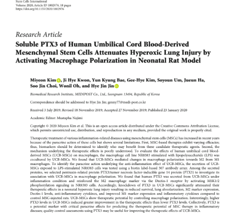 В исследовании показано, что растворимая форма PTX3, выделенная из мезенхимальных стволовых клеток пуповинной крови человека, снижает повреждение тканей, вызванное гипероксией, за счёт модуляции макрофагов и уменьшения воспалительной реакции. Эти данные подчёркивают потенциал молекул, содержащихся в продуктах, таких как P198 ExoHealer, в регуляции иммунного ответа и снижении воспаления — в том числе при состояниях, сопровождающихся кожными повреждениями, воспалением и нарушением барьерной функции кожи.
