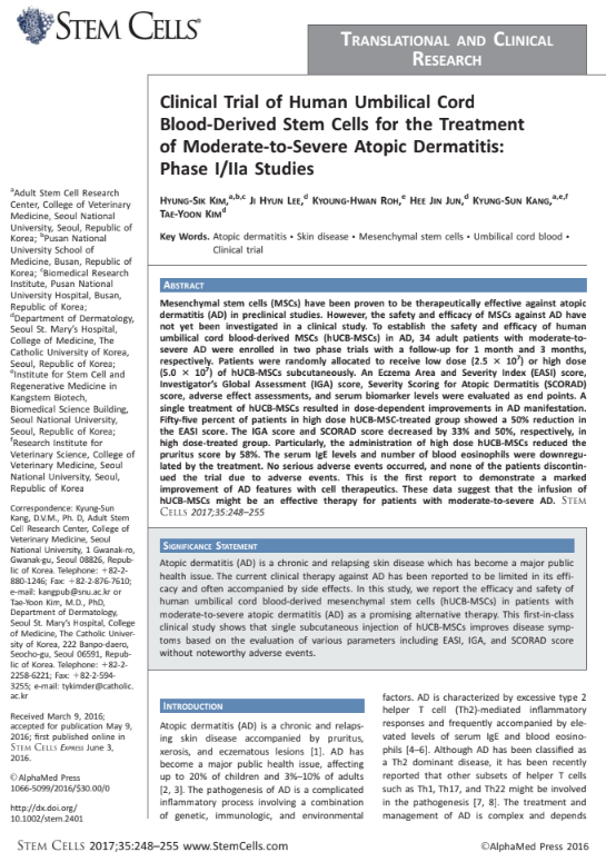 В первом и втором этапах клинического исследования было подтверждено, что мезенхимальные стволовые клетки, выделенные из пуповинной крови человека, обладают высокой безопасностью и способствуют значительному снижению симптомов атопического дерматита. Показано уменьшение зуда, воспаления и улучшение общего состояния кожи. Эти результаты подтверждают потенциал препаратов, содержащих биологически активные молекулы UCB-MSC, таких как P198 ExoHealer, в комплексной терапии хронических воспалительных дерматозов.