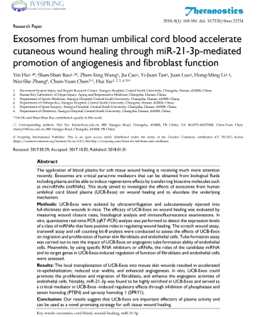В исследовании показано, что экзосомы, выделенные из пуповинной крови человека, способствуют заживлению кожных ран за счёт ангиогенеза и активации фибробластов, преимущественно через miR-21-3p. Это подтверждает потенциал экзосом, содержащихся в продуктах типа P198 ExoHealer, в стимуляции кожной регенерации.