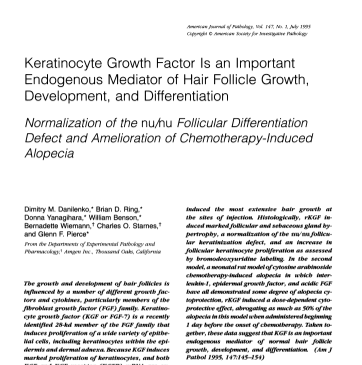 В доклиническом исследовании показано, что KGF (фактор роста кератиноцитов) является важным медиатором роста и дифференцировки волосяных фолликулов. Он способствует пролиферации клеток, морфогенезу фолликулов и поддержанию их функции. Эти данные подчеркивают значимость KGF-подобных молекул, входящих в состав препаратов, таких как P198 ExoHealer, в трихологической терапии.