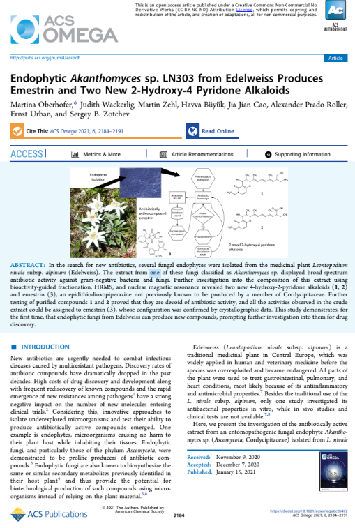 В исследовании описано выделение эндофитного гриба Akanthomyces sp. LN303, ассоциированного с Leontopodium alpinum (эдельвейс), который продуцирует биоактивные соединения — эместрин и два новых 2-гидрокси-4-пиридоновых алкалоида. Эти молекулы проявляют выраженную антимикробную активность, что подчёркивает потенциал растений рода Edelweiss как источника природных компонентов с защитными свойствами. Данные соединения могут представлять интерес для разработки препаратов с антимикробным и противовоспалительным действием, аналогичных тем, что используются в линии P198 ExoNature.